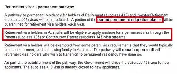 根据预算案,从2018-19财年起,持有退休签证(Retirement,subclass410以及Investor Retirement subclass405)签证的人将会转入永居通道(pathway to permanent residency)!